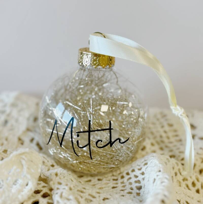 Kerstbal doorzichtig/goud met naam (zwarte letters)