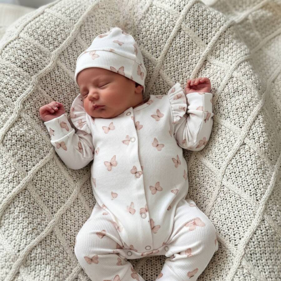 De liefelijke vlinders, gecombineerd met de verfijnde ruffle-schouders, geven het pakje een romantische en elegante uitstraling. Dankzij de handige drukknoopsluiting over de volledige lengte is verschonen super eenvoudig. Het bijpassende mutsje maakt de outfit helemaal compleet – perfect als kraamcadeau of newborn setje.